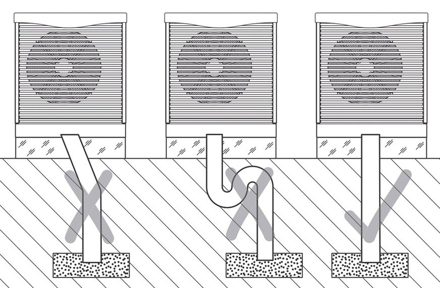 Hierbei sollte unbedingt ein Leerrohr für den Kondensatablauf berücksichtigt werden. Dabei spielt die Kondensatableitung eine wichtigere Rolle als oftmals angenommen, denn an einem Sommertag mit hoher Luftfeuchtigkeit können pro Stunde bis zu 20 l Kondensat entstehen. Das Kondensat muss vor der Ableitung nicht behandelt werden. Vielmehr handelt es sich quasi um destilliertes und damit chemisch reines Wasser. Aber auch für den Wintereinsatz ist die sichere Kondensatableitung relevant, um z. B. Eisflächen im Umfeld des Außengerätes
