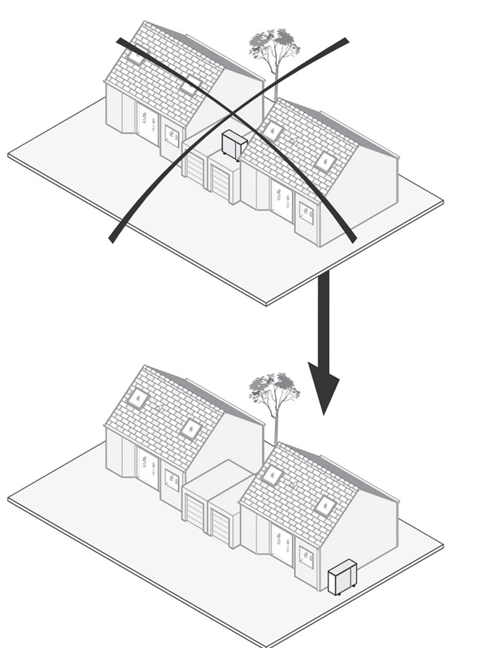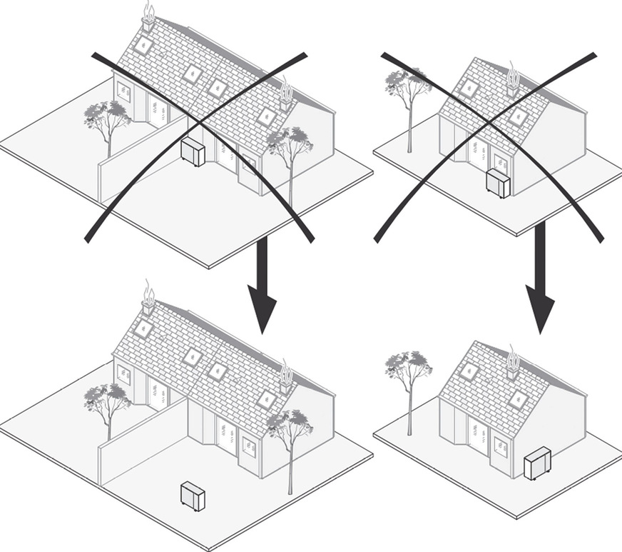 Die Geräteausblasseite darf nicht zum Gebäude positioniert werden. Außerdem sollte sich die Außeneinheit nicht unter laubabwerfenden Bäumen oder an Orten befinden, an denen ggf. Schneeverwehungen möglich sind. Ebenso ungeeignet sind Stellen, an denen starke Winde auf den Luftauslass der Außeneinheit einwirken. Hierfür sollte auch die vorherrschende Windrichtung geprüft und das Außengerät möglichst quer zur Hauptwindrichtung aufgestellt werden.