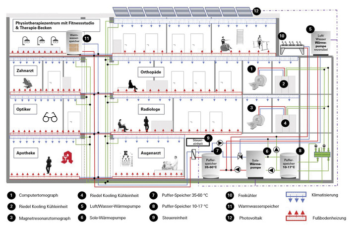Insgesamt wird mit der Systemlösung ein echter Mehrwert generiert. Auch mehrstöckige Ärztehäuser, in denen mehrere Praxen unter einem Dach zusammenarbeiten, lassen sich so, unter Einsatz von wenig elektrischer Leistung, effizient mit Energie versorgen, also beheizen, klimatisieren und mit Warmwasser versorgen.