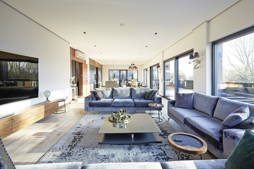 In einem Gebäude der hier beschriebenen Größe ist eine stille Kühlung über die Fußbodenheizung zwar möglich, aber nicht so effektiv wie der Einsatz von Klimageräten. In vier Räumen ließ man deshalb jeweils ein Wandgerät der Remko-Serie WLT installieren. Drei Modelle weisen eine Leistung von maximal je 3,2 kW und das vierte von 9,4 kW auf. Es wurde für den großen Wohn-Essbereich vorgesehen.