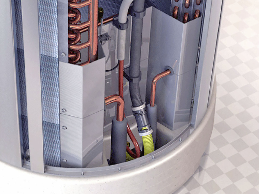 Das Innenmodul wurde im Technikraum im Erdgeschoss aufgestellt. Alle wichtigen Anschlüsse befinden sich oben auf dem 1 050 mm hohen Gerät, was die Installation vereinfachte. Eine leistungsgeregelte Umwälzpumpe sowie ein integriertes elektronisches Bypassventil, das den Mindest-Volumenstrom sicherstellt, tragen zum effizienten Betrieb bei. Das hermetisch schallisolierte Gehäuse aus EPP-Formteilen minimiert die Energieverluste und senkt die Geräuschemissionen, ebenso wie der speziell schallisolierte Scroll-Verdichter.