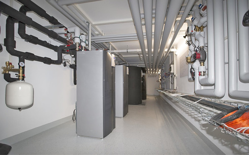 Die Heizenergie liefern zwei Sole/Wasser-Wärmepumpen von alpha innotec vom Typ alterra SWCV 162 mit jeweils 16 kW Leistung. Den Löwenanteil ihrer Energie beziehen die invertergesteuerten, also modulierenden Geräte von einer Geothermieanlage mit sieben knapp 100 m tiefen Erdsonden. Durch ihre Invertersteuerung richtet sich die Verdichterdrehzahl der Wärmepumpen automatisch am Wärmebedarf des Gebäudes aus; daher laufen sie immer am optimalen Betriebspunkt. Das verringert den Stromverbrauch und erhöht die Lebensdauer der Maschinen.