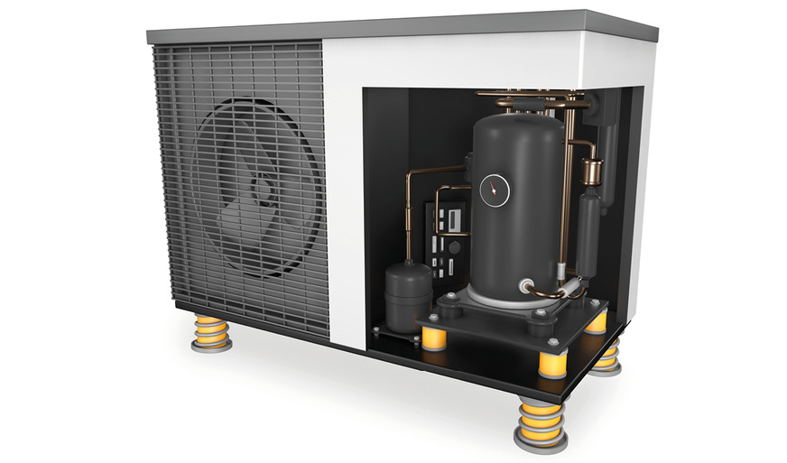 Auch bei kritischen Aufstellungsorten von Luft / Wasser-Wärmepumpen, beispielsweise auf Flachdächern oder an Außenwänden, bietet Getzner gezielte Lösungen an. Wichtig sei es darauf hinzuwirken, dass die Gerätehersteller auf die preisgünstige aber nicht effektive Gummilagerung zugunsten von PUR-Materialien verzichten. Werde der komplette Innenaufbau einer Wärmepumpe, also Kompressor, Wärmeübertrager und Kondensator, auf einen Stahlrahmen montiert und dann mittels Isotop-Federn oder Isotop-MSN-Elementen gelagert, sei bei einer Störfrequenz von 25 Hz und 1500 U/min eine Effizienz des Asonators von 96 Prozent erreichbar. Die gute Nachricht: Auch Wärmepumpen ohne herstellerseitige Vibrationsentkopplung können nachgerüstet werden, so Marte.